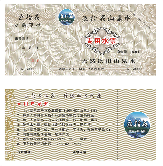 该水票运用了防伪底纹、浮雕效果、流水号、防伪团花技术