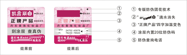 使用方法:在标签上找到滴水消失防伪的标记,取一小滴水,将水滴到标签上,迅速会出现隐藏在标签内的滴水防伪文字或者图案。