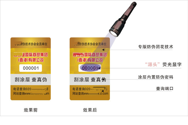 荧光又称紫外线光,使用特殊荧光油墨结合到标签上,肉眼和手感触摸无法找到流水码、文字或图案所在处,必须使用荧光灯也就是紫外线灯照射才能看到,隐形荧光流水码一般使用在企业防窜货上较广,隐形文字、图案多用于防伪技术。