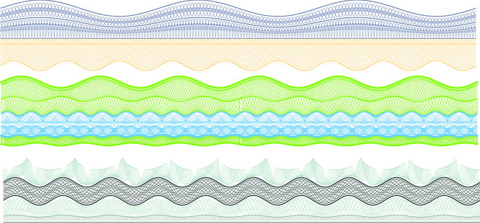 花边:用于印刷在产品的边缘,用各种不同的复合式花边,通过变化它的元素和色彩已达到装饰和防伪的作用。