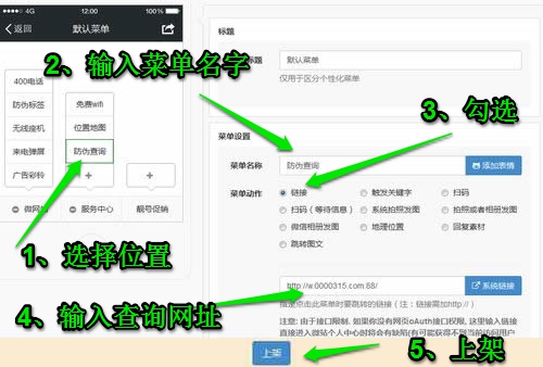 选择菜单位置→输入菜单名字→勾选“链接”→输入查询网址 (http://w.0000315.com:88/ 商家网址也可) →上架。 接着用个人微信号关注公众号,点击防伪查询体验强大的微信防伪吧。详情看上面。