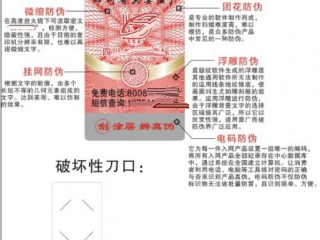 2.防伪的可靠性。它浓缩了多项高科技手段所具有的防伪机理。防伪者即使掌握了该防伪标识的制造方法,也无法对某一产品的防伪标识进行有效的仿制;不仅无法批量制造使用,而且在经济上得不偿失,时间上也不允许。实现了技术的可转让性和防伪标识的不可仿造性的二者有机统一。